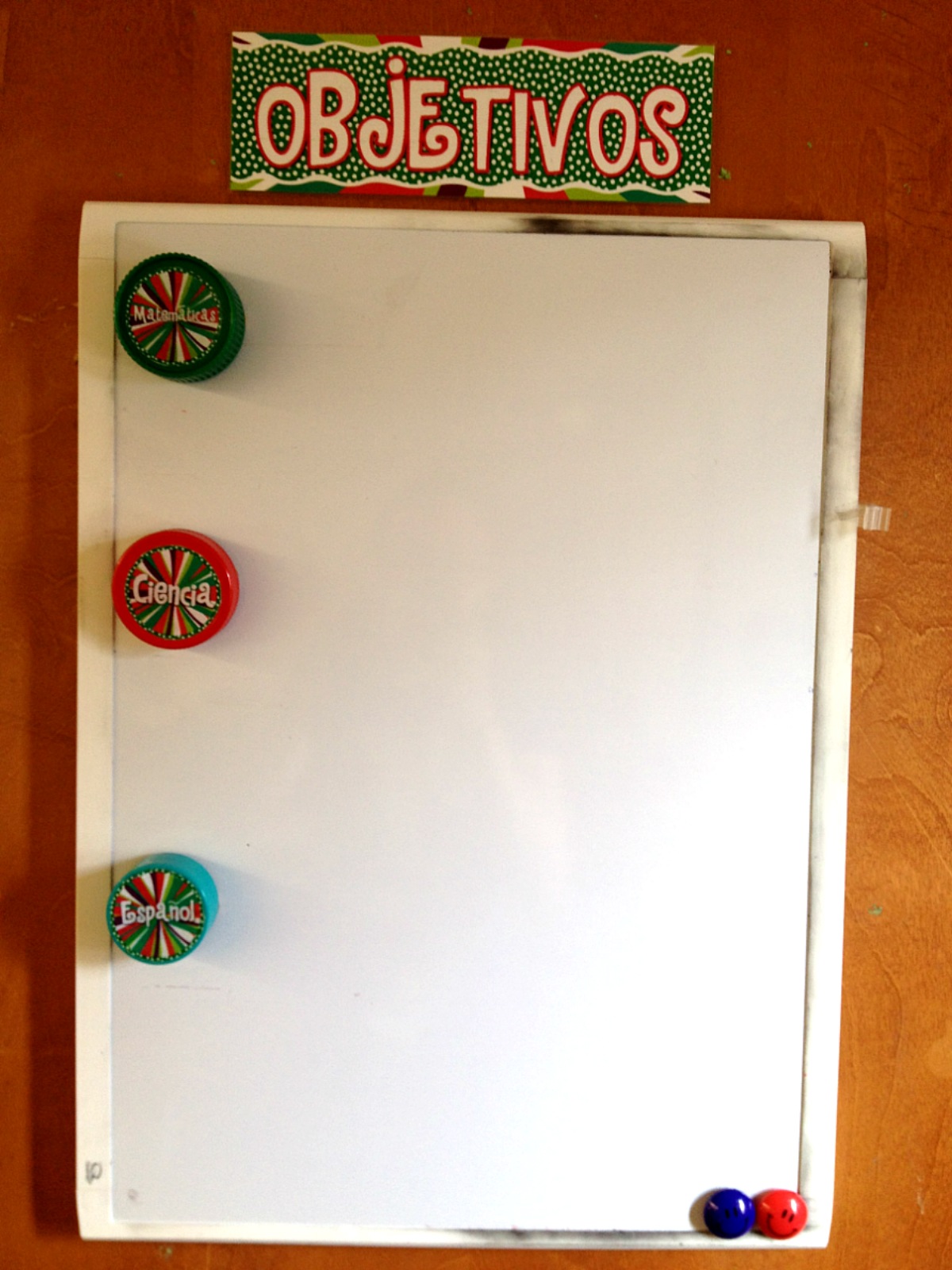 Here’s our “Pared de Palabras.” The alphabet labels are made from juice caps and other lids. You can see how I did it and download free alphabet stickers here.
